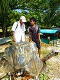 Tandis qu'un local et Domi s'entretiennent longuement sur les astuces utilisées par les pêcheurs pour motoriser à pas cher leurs embarcations |