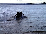 A la baie de Tamarin, site prisé par les surfeurs, les vagues ne sont pas hautes aujourd'hui, mais les surfeurs non plus ne sont pas bien hauts |