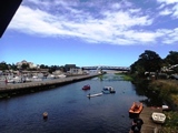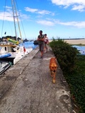 Petite marche sur le port de plaisance, devancés par "Youki"; un moment agréable pour nous, mais les chiens errants sont un véritable problème dans l'île |