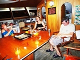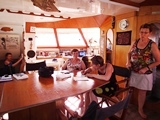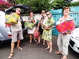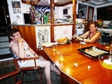 Après le marché, retour à bord, et les invitées se mettent aux cartes postales |