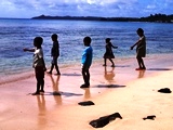 Derrière le terrain du festival, les enfants jouent à la plage |