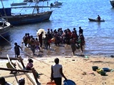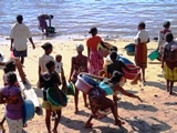 Dès qu'un bateau arrive, les femmes se précipitent à sa rencontre avec les bassines |