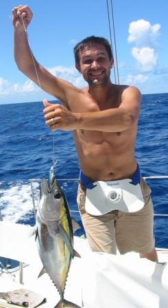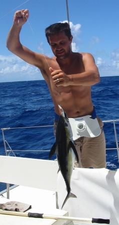 Domi est positionné sur la jupe arrière pour ne pas perdre de temps à remonter le poisson à bord.