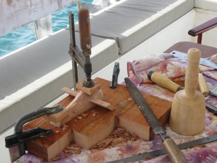 Domi fabrique une ligne à thon (façon André Monnier) pour l'installer sur l'autre coque et multiplier nos chances d'attraper un poisson.
